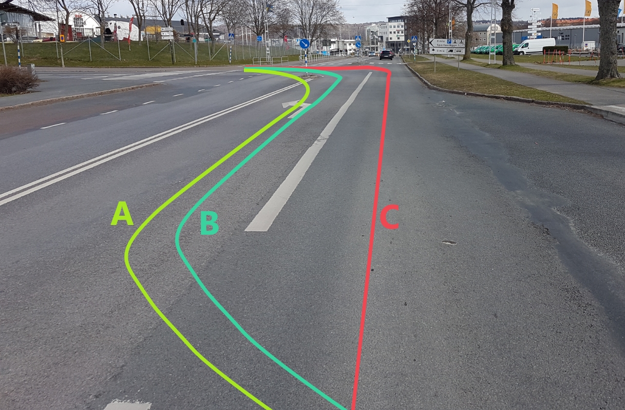 - När du kör så bör du vara medveten om vilka typer svängar cyklister och klass II-mopeder får göra. På den här bilden (bild 1) kan de svänga vänster här genom väg B. Men de får även hålla sig på höger sida av vägen (markerat med C) om de planerar att svänga till vänster här. De får dock inte korsa heldragna linjer, vilket är fallet i väg A.