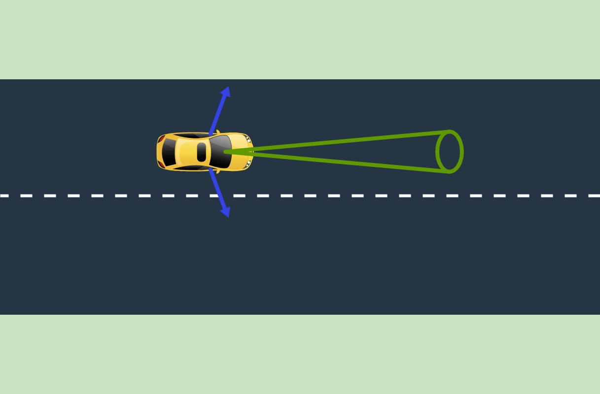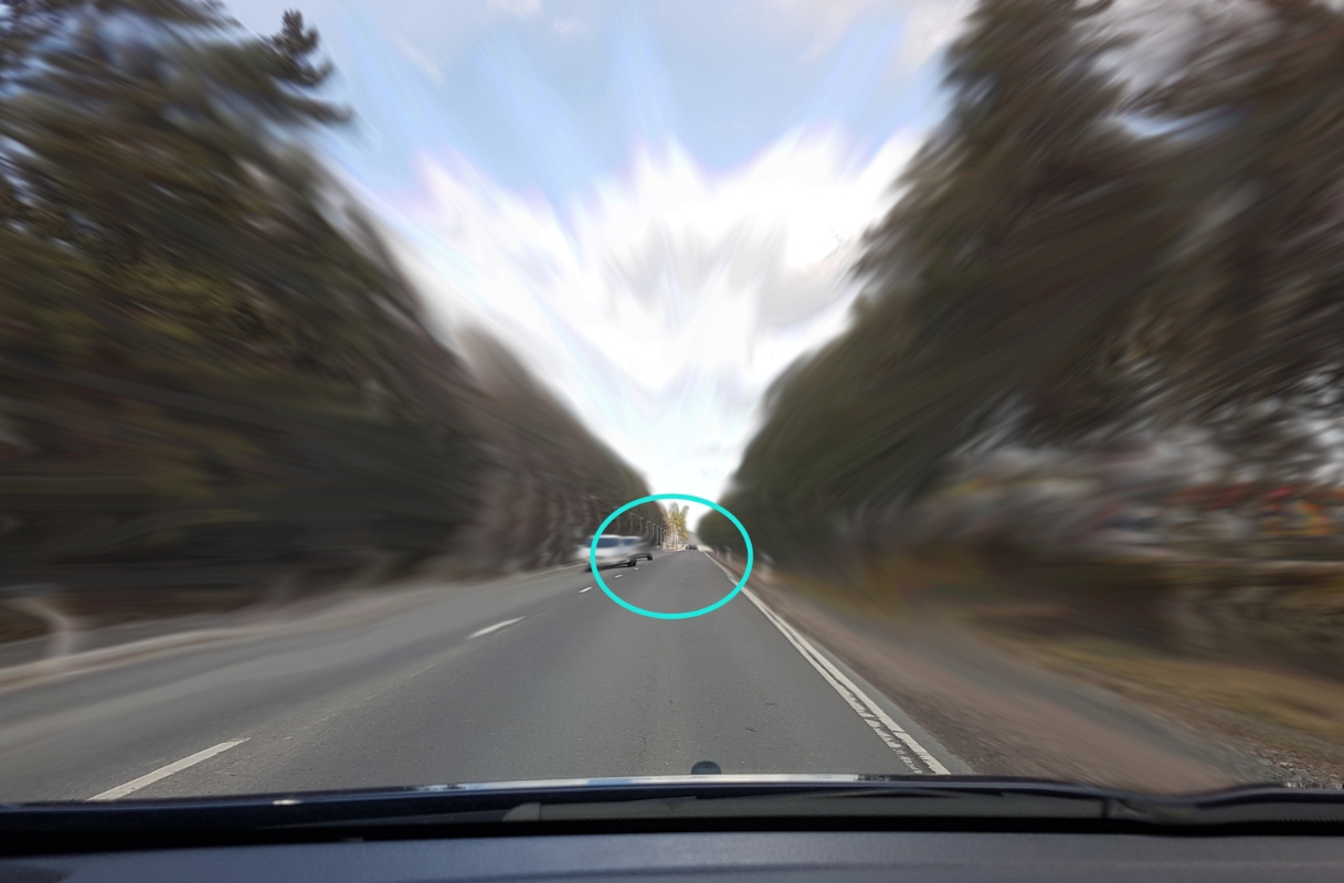 - Tunnelseende (bild 2) är fenomenet som uppstår när du kör med högre hastighet och resulterar i att ditt synfält blir smalare så att du fokuserar mindre på det som inte finns på vägen direkt framför dig. Resultatet blir att din blick är mycket mer fokuserad på det som finns direkt framför dig (exempelvis området i gröna cirkeln i bilden) än på det som händer omkring dig. Detta fenomen uppstår även om du inte är trött.