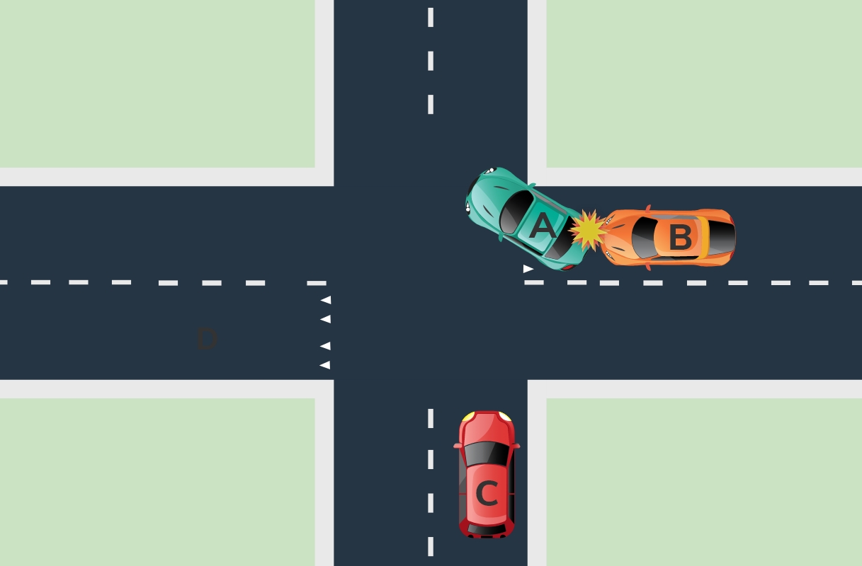 - Oavsett om någon har skuld vid eller har orsakat en olycka måste en trafikant som är inblandad i en olycka stanna kvar på platsen. Om du exempelvis kör bil C (bild 2), och bil A måste stanna för dig, men bil B kör in på bil A. Då måste du stanna kvar på platsen då du är inblandad eftersom bil A var tvungen att stanna för dig för att lämna företräde till dig.