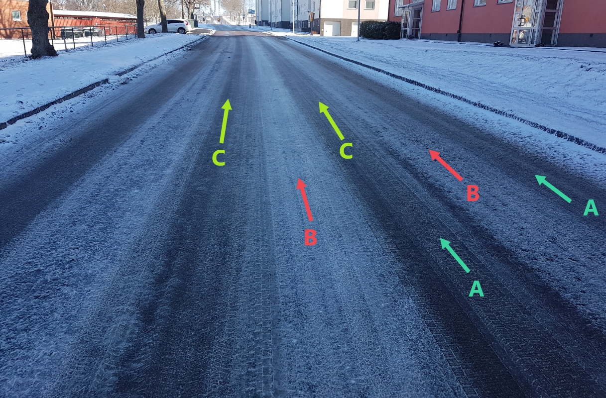 - När det snöar då kan det vara svårt att se vägen tydligt. I denna bild (bild 1) visas några par linjer. Du bör försöka hålla hjulen på linjerna A. Detta är p g a det verkar som att vägytan på linjerna B är mer hal än på linjerna A, och att köra på linjerna C skulle innebära att du kör mitt på vägen.