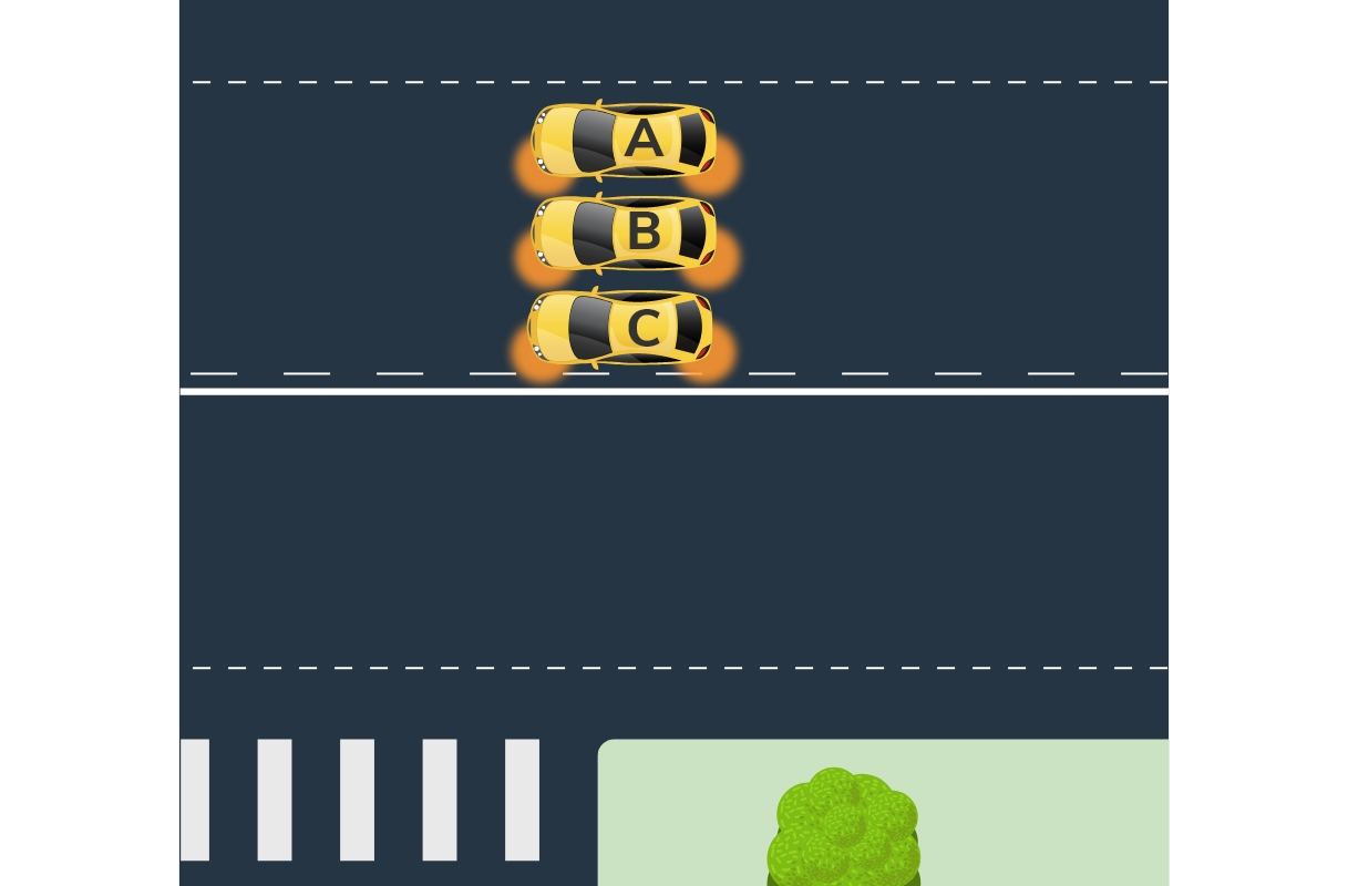 - I denna bild (bild 3) visar bil C den korrekta placeringen vid vänstersväng på denna väg. Då det finns, om du placerar dig som bil A eller B, en mycket större chans att en bil kan köra in i dig bakifrån vid svängen, precis som indikerat i bilden.