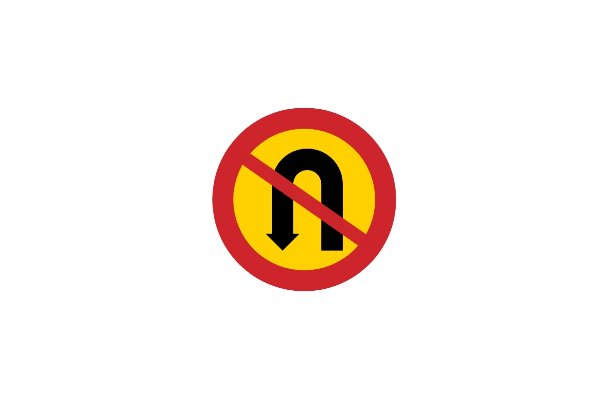 - När det finns en ”Förbud mot U-sväng” skylt (bild 6) då får du fortfarande svänga vänster eller höger. Då det inte finns ett generellt förbud mot att svänga åt varken vänster eller höger om det skylten "Förbud mot U-sväng" (C26) är uppsatt.